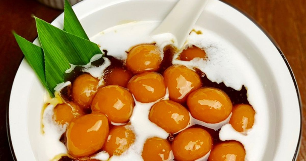 - Masukkan bola ubi ke dalam kuah santan hangat.